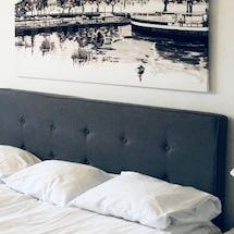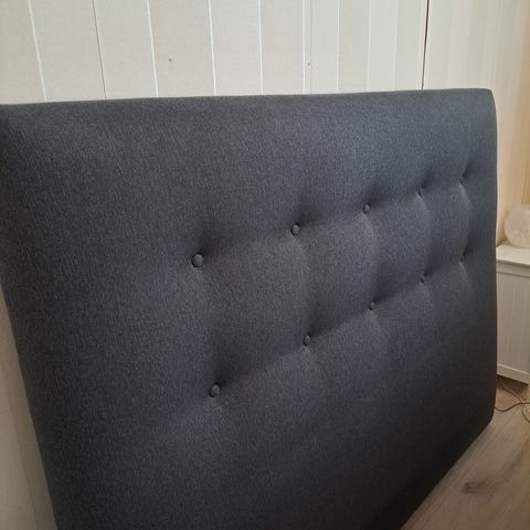 Kankainen kauniin tummanharmaa Askon sängynpääty 160 cm. Kuvassa näkyy kankaan tekstuuri. Päällinen on irrotettava ja pestävä. Kunto on hyvä ja siisti. Kiinnitetään sängynrunkoon.