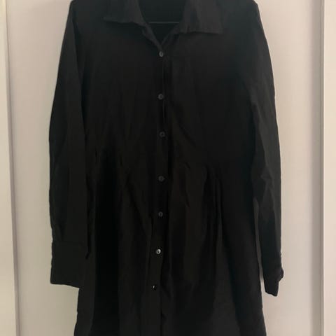 Käyttämätön pitkähihainen ja pitkä helmainen mekko. Pituus olka-helma 123cm. Napitus edessä ylhäältä alas. Vyötäröllä kuminauha sekä solmittava vyö, joka irrotettavissa. Pohja väri musta.