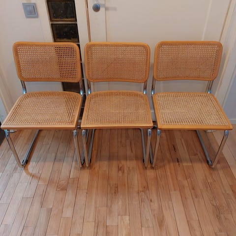 Tuoleissa on havaittavissa kulumaa. Istuinosien kiinnityksistä puuttuu mutteri, joka pitää istuinosaa kiinni (helppo lisätä). Yhden istuimen punoksessa reikä ja toisessa verhoilussa reikä.