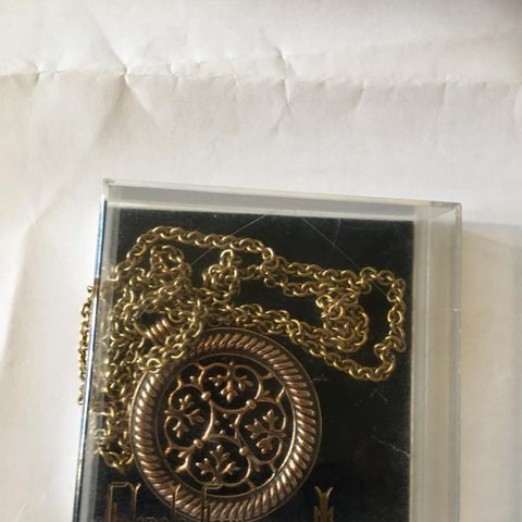 Kerran käytetty pronssinen Mielikki -vintageriipus alkuperäisessä rasiassa. Voi käyttää kaulakoruna tai solkena. Keskellä meripihka-"kivi". Suunnittelija Germund Paaer.