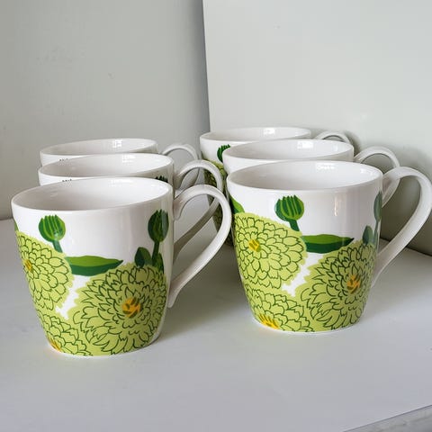 Iittala Marimekko Primavera -mukit (6 kpl) vaalean vihreällä kukkakuviolla. Valkoinen posliinimuki, jossa vihreäsävyinen kukka- ja lehtikuviointi ulkopinnalla. Muki on yhteistuotantoa Iittalan ja Marimekon välillä, mikä ilmenee pohjassa olevasta merkinnästä.