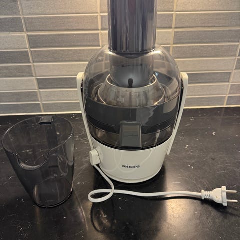 Philips mehustin kotikäyttöön. Laitteessa on suuri syöttöaukko hedelmille ja vihanneksille, läpinäkyvä kansi sekä erillinen mehukannu mitta-asteikolla. Rungossa on metallipintaa ja mustia muoviosia. Mehustimessa on tippa-astia ja ulostuloputki valmiin mehun kaatamista varten.