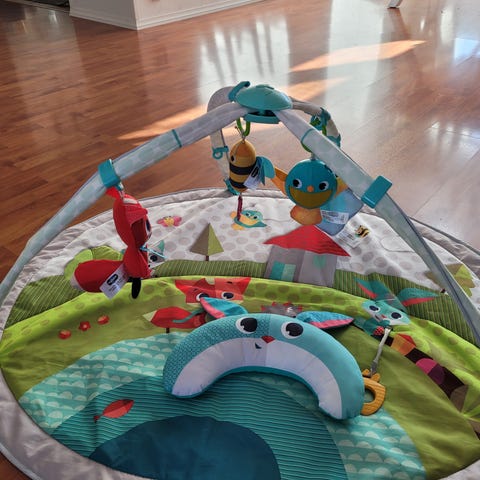 leikkimatto jossa tukeva puinen lelukaari. Lelut saa irti ja niiden paikkaa voi vaihdella. Puisen lelukaaren saa irrotettua matosta ja sitä voi käyttää esim. sitterin kanssa.