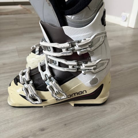 Dalbello laskettelumonot, koko 27,5 (mondopoint). Väri harmaa oranssein yksityiskohdin. Monossa useita solkia ja tarrakiristys varressa. Sopivat lasketteluun rinteissä. Kovuudesta tai tarkemmasta mallista ei ole lisätietoa.