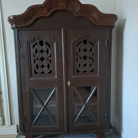 Ilmeisesti 1800-1900 luvun vaihteesta. Artesaani oppilastyönä entisöity. Hieno sisustuselementti. Jäänyt tarpeettomaksi. Kaappi kuopiossa mutta voidaan toimittaa lähietäisyydelle.