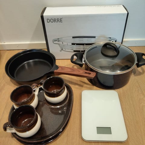 Coline-merkkiset kattilat. Sivut kuparia, muuten terästä. Paksu pohja, joten ruoka valmistuu tasaisesti. Ei lommoja eikä isoja naarmuja. Kupari tummuu vedestä ja ilmasta. Nyt puhdistettu lempeimmällä tavalla eli sitruunalla ja suolalla, jäi joitain veden jälkiä. Järeämpiä konsteja on. Puhdistuksen jälkeen huuhtelu, kuivattava heti, jotta kyseisiä veden jälkiä ei jää. Hyvät kattilat, mutta edelleen pienennän huushollin kokoa.