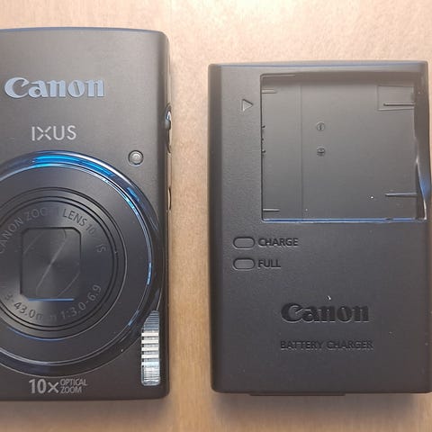 Täysin toimiva kamera. Väri kulta. Pieniä pintanaarmuja, jotka yritin parhaani mukaan saada kuviin. Eivät käyttöä haittaa. Mukaan laturi ja muistikortti.