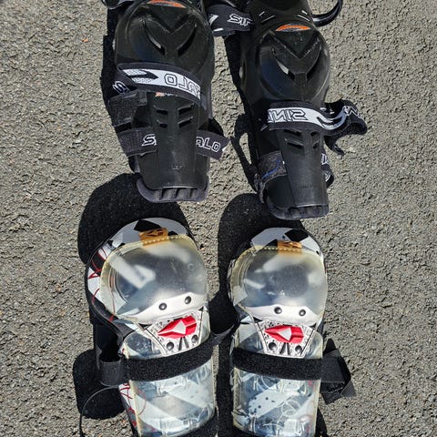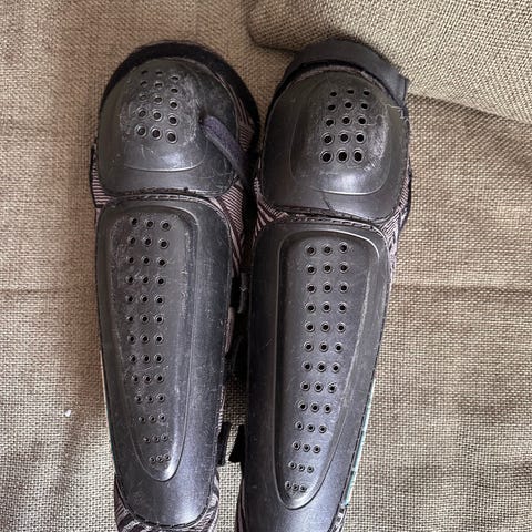 Acerbis polvisuojat, väri musta punaisin yksityiskohdin. Kovamuovinen ulkokuori ja useita säätöhihnoja istuvuuden säätämiseen. Suunniteltu suojaamaan polvia esimerkiksi moottoripyöräilyssä tai muissa lajeissa, joissa tarvitaan iskusuojia polvien alueelle.
