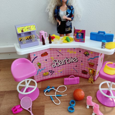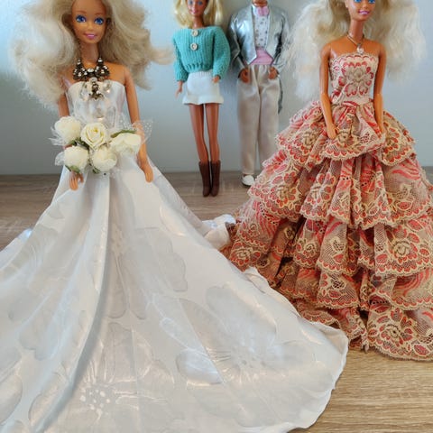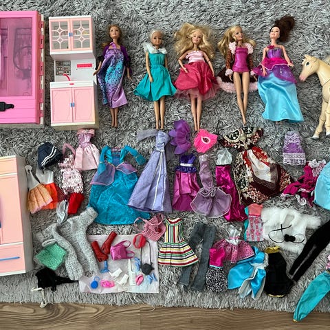 Barbie nukke ja makuuhuoneen kalustesetti. Settiin kuuluu Barbie-nukke pitkällä sinisellä iltapuvulla sekä useita makuuhuoneen huonekaluja ja tarvikkeita: pylvässänky ja verhot, vaaleanpunainen peitto ja tyyny, kampauspöytä peilillä ja laatikoilla, jakkara, kaappikello, kukkateline, matto, tyyny sekä pieniä koriste-esineitä ja pulloja. Kaikki tekstiilit sekä Barbien mekko on pesty. Kaikki siistissä kunnossa.