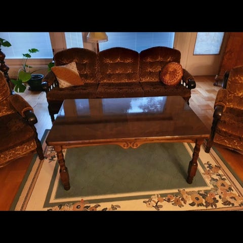 Myydään harvoin tarjolla oleva, täysin alkuperäiskuntoinen 1940-luvun Chippendale-kalusto. Tämä setti on säilynyt vuosikymmenet samassa perheessä ilman entisöintejä tai muutoksia. Puuosat ovat ryhdikkäät ja kauniisti veistetyt.