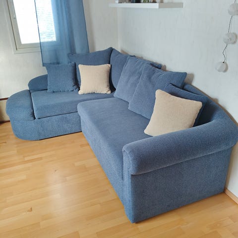 Elämää nähnyt divaanisohva, noin 7 vuotta vanha. Kangas ehjä, voisi tosi kaivata jo pesua. Viime pesusta jokunen vuosi aikaa.