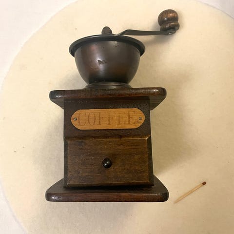 Seinään kiinnitettävä kahvimylly. Kuvat täydentävät kuvausta.