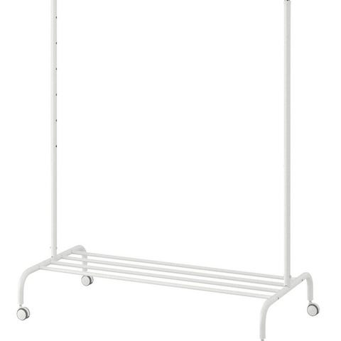 IKEA vaaterekki valkoista metallia. Soveltuu vaatteiden ripustamiseen esimerkiksi eteisessä, makuuhuoneessa tai vaatehuoneessa. Kevyt ja siirrettävä rakenne, avoin malli helpottaa vaatteiden näkyvyyttä ja käyttöä. Sopii käytettäväksi tavallisten vaateripustimien kanssa.