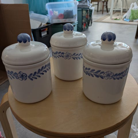 Ehjä siisti purkki kannella, ei säröjä. Vaikkapa kekseille, rusinoille, karkeile, mausteille jne. Valmistusmaata tai ikää en osaa sanoa. Koko kannen kera n. 12 x 12 cm.