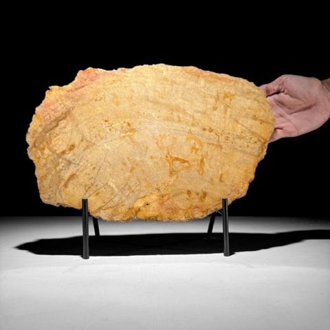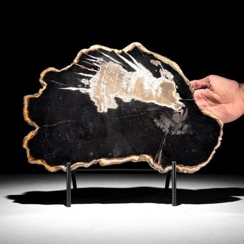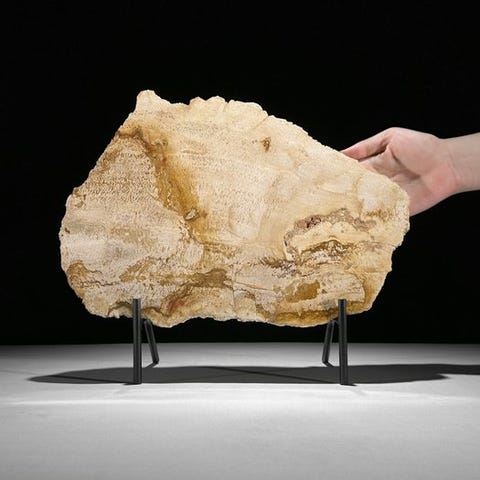 Upea pala fossiloitunutta puuta räätälöidyllä jalustalla.Kivettynyt puu on mineraalisoitunut kappale puusta, joka on muodostunut, koska puut kaatuivat ja peittyivät maaperän tai hiekan kerrokseen. Usein tämä tapahtuu luonnonkatastrofin seurauksena. Kivettyneen puun värit riippuvat maaperän tai hiekan mineraaleista. Jokainen mineraali luo oman värinsä. 'Kivettyminen'-prosessi varmistaa, että kaikki ominaisuudet, kuten solmut, kuori ja vuosirenkaat, säilyvät. Mahdollisesti hajoava prosessi kaukaisessa menneisyydessä voi johtaa upeisiin kristallimuodostelmiin, usein monivärisinä.Noin mitat jalustan kanssa:Korkeus: 29,5 cm - Leveys: 39 cm, Viipaleen paksuus: 1,9 cmNoin mitat ilman jalustaaKorkeus: 28 cm - Leveys: 39 cm, Viipaleen paksuus: 1,9 cmVASTUUNRAJOITUKSET:- Huomioithan, että yksi kuvista on otettu hämärässä studiossa; värit voivat vaihdella ympäristön mukaan.Paino, joka mainitaan, sisältää pakkausmateriaalin.LähetysKohde lähetetään seurantanumerolla DHL Parcelin, DPD:n tai postNlin kautta. Seuranta päivittyy Catawiki-luettelossasi, kun pakettisi on jätetty postiin.Ole hyvä ja tarkista säännöllisesti välttääksesi pakettisi palautumisen meille, jolloin ostaja vastaa toisen lähetyksen toimituskuluista.Seurantaan Espanjaan ja Portugaliin käytä tätä linkkiä ja lisää Catawiki-erästäsi saatu seurantanumero.https://clientesparcel.dhl.es/LiveTracking/HomeEMME YHDISTÄ TOIMITUKSIA!!!- Jos sinulla on kysyttävää paketistasi, ota yhteyttä meihin Catawiki-viestipalvelun kautta. Yritämme vastata kolmen työpäivän kuluessa.