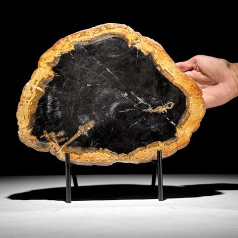 Häikäisevä kivettyneen puun viipale omalla jalustallaan. - Kivettynyt puu ()