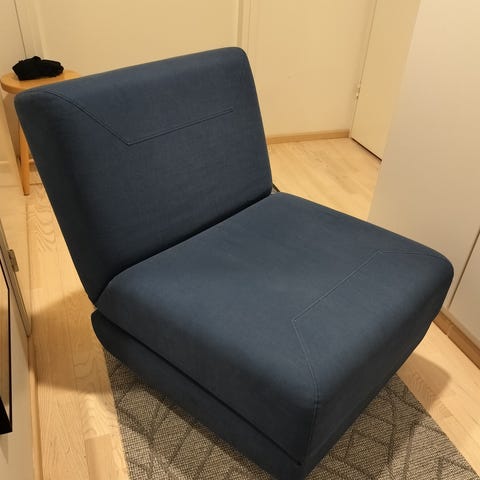 Tapio Anttila Design. Yhden hengen nojatuoli avattavissa sängyksi. Mukaan kuuluu alkuperäinen koristetyyny, jossa sisällä petauspatja. Edessä kaksi pyörää(lukittavissa) ja takan kiinteät jalat. Nojatuolin selkänojana kaunis puinen selkänoja. Väri harmaa.