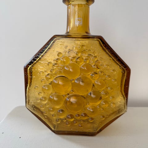 Harvinaisempi ruskea Riihimäen lasin valmistama pullo. Pullon suunnittelija ei tiedossa . Pullo hyvässä kunnossa. Pullon korkeus 23 cm.