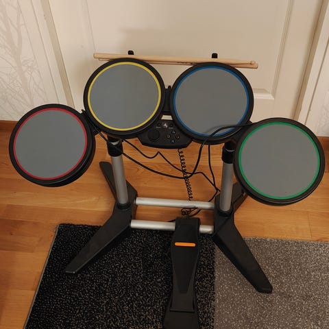 Setti sisältää rummut (langallinen) + kapulat, kitaran + dongle ja mikrofonin (langallinen).