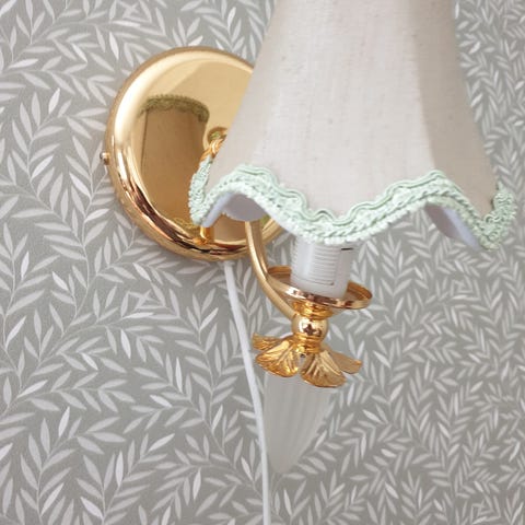 Vintage seinävalaisin 80-luvun. Kullatulla metalli varrella ja kaarevalla viiva kuvioidulla lasilla. Korkeus 26cm ja leveys 20cm. Stockmann valaisin tarralla.