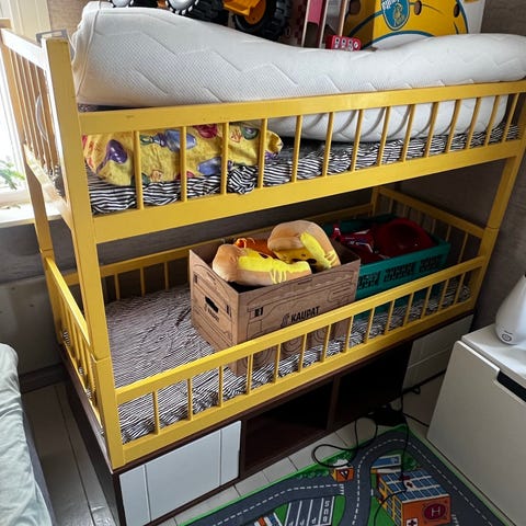 Kotimainen kestävä ja tukeva käsityönä tehty Roope-Riikka jatkettava kerrossänky pystyillä portailla (alasängyssä turvalaita) + 2 kpl palapatjoja (palojen koot 30/50/120 cm). Väri kuultovalkea (puunsyyt näkyvät maalin alta). Sängyn pituuden säätö antaa muunneltavuutta lapsen iän ja sängyn sijoittamisen suhteen, myös portaat voi vaihtaa toiselle puolelle. Pieniä käytön jälkiä on, mutta kokonaisuus siisti. Sängyn korkeus 161 cm, leveys 92 cm, patjan leveys 80 cm. Sängyt toimivat myös erillisinä.