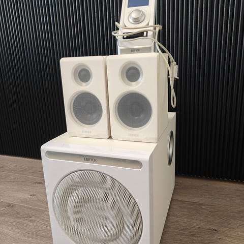 Vähällä käytöllä olleet Edifierin aktiivikaiuttimet. Mukana tulevat kuvien 3.5mm-RCA johto, kaiuttimien välille tuleva pitkä johto, sekä kaukosäädin.
