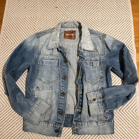 Miesten Levis farkkutakki, koko S. Muuten hyvässä kunnossa, mutta oikeassa hihassa kohta, mistä kulunut väriä pesun yhteydessä