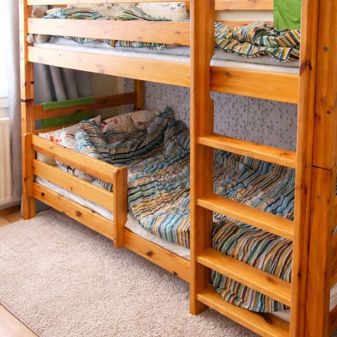 Keltainen, vanha, pinnalaitainen kerrossänky, jossa alimmaisena ruskea hyllykkö/laatikosto. Kahdessa laatikossa on hieman aukeamisongelmia.