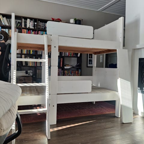 Yläsängyn saa nostamalla irti, mutta alasänky on kiinnitettynä laatikostoon. HUOM! Alaosa on TODELLA painava, ja omat kantajat on oltava mukana. Vain nouto!