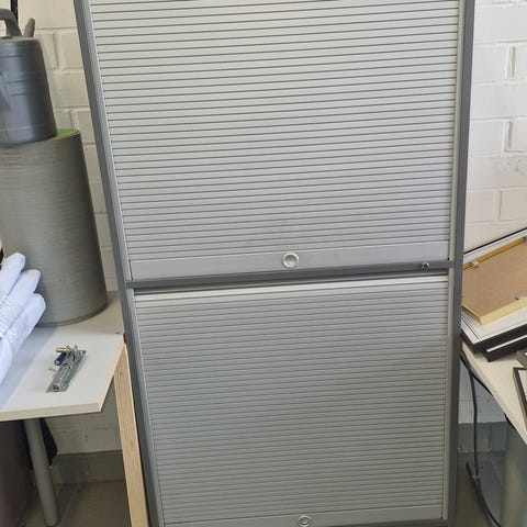 Rulo-ovellinen toimistokaappikokonaisuus, jossa useita moduuleja säilytykseen. Kaapeissa on vaaleat puukuvioiset rulo-ovet ja musta runko. Sisäpuolella on useita vaaleita hyllyjä ja laatikostoja papereille, kansioille ja toimistotarvikkeille. Kokonaisuus soveltuu toimiston, työhuoneen tai muun työtilan säilytysratkaisuksi. Rulo-ovet liukuvat ylös ja alas ja mahdollistavat tilatehokkaan käytön myös ahtaammissa tiloissa.