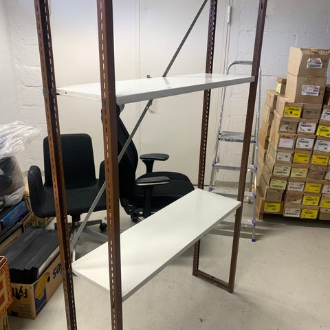 Metallinen valkoinen pyörillä varustettu korihylly