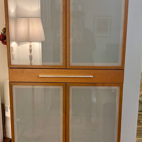 Annetaan valollinen, kaunis ja ehjä lasivitriini kaappi pois tilanpuutteen vuoksi. Vitriinissä kolme ehjää lasihyllyä ja kaksi valoa. Alakaapissa umpiovet ja molemmilla puolilla ysi välihylly. Tässä kaunis kaappi nopeimmalle.