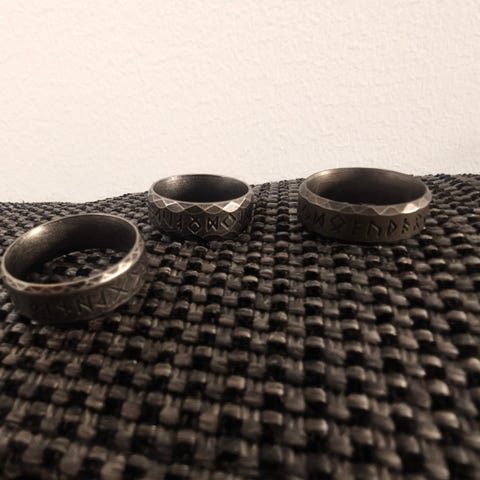 Lykka Viking Valknut kulta-hopea kantasormus on näyttävä viikinkiaiheinen kantasormus, jossa on riimukaiverruksten keskellä Valknut-symboli.