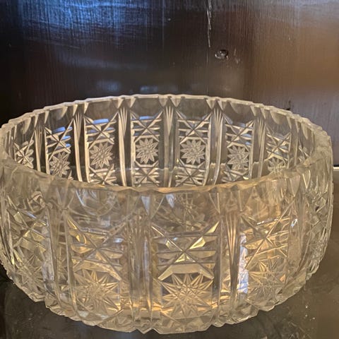 Tarjoiluastiaksi sopiva, kuvioitu kristallikulho. Ehjä ja hyväkuntoinen.