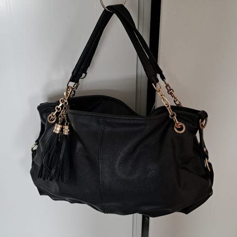 Materiaali on pehmeää ja hieman kiiltävää, helppo pitää puhtaana ja näyttää hyvältä käytössäkin. Laukussa on tukevat kantokahvat metallirenkailla, jotka tekevät siitä jämäkän ja mukavan kantaa. Etupuolella on kätevä vetoketjutasku pienille tavaroille, ja sisäpuoli on tilava – sinne mahtuu helposti vaihtovaatteet, läppäri, kosmetiikkapussi tai vaikka salikamat. Metalliset niittiyksityiskohdat tuovat pientä rock‑henkeä, mutta kokonaisuus pysyy tyylikkäänä ja helposti yhdisteltävänä.