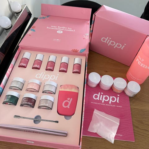 Iso, osin käyttämätön Dippi kynsienhoitosetti sisältää 8 eri väristä dippi-puuteria ja kaikki tarvittavat nesteet kynsien tekemiseen ja poistamiseen. Sopii kotikäyttöön dippi-kynsien tekemiseen ja huoltoon. Mukana tulevilla ohjeilla ja You tubessa olevilla videoilla tekemisen oppii helposti. Itsellä ei vaan viitseliäisyys riittänyt ja näistä teinkin kynnet vain kahdesti. Kaikki on moitteettomassa kunnossa, eikä esim nesteissä ole kuivumisen tai likaantuminen merkkejä.