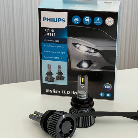 Philips X-tremeUltinon LED-HL H11 -ajovalopolttimot. Pakkaus sisältää kaksi H11-tyyppistä LED-ajovalopolttimoa sekä ohjainmoduulit ja käyttöohjeen. Valon väri on noin 5800 K, eli kylmän valkoinen. Polttimot on tarkoitettu ajoneuvon ajovaloihin ja ne korvaavat H11-halogeenipolttimot. Tuote on suunniteltu erityisesti rata- ja rallikäyttöön; pakkauksessa on maininta, ettei polttimoita ole tarkoitettu tieliikennekäyttöön. Sopivuus riippuu ajoneuvon H11-kannasta ja tilasta ajovalon sisällä. Oleet kyllä Nissan Qashqain nokalla ilman ongelmia.