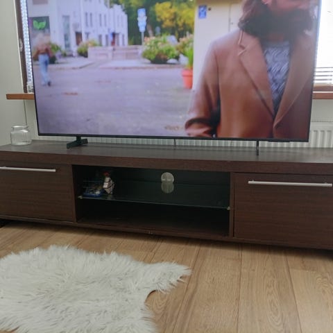 Tv-taso, molemmissa päädyissä laatikot ja keskellä hylly, taustalevyssä valmiina johdoille paikka.