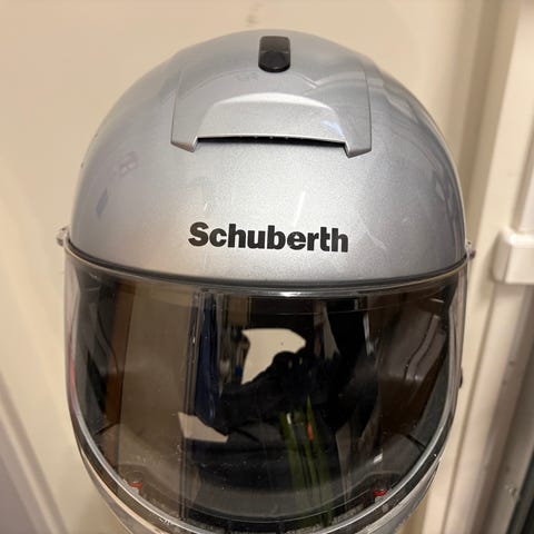 Schuberth C2 -moottoripyöräkypärä, koko 58/59. Kypärä on avattakypärämallinen ja siinä on kääntyvä visiiri ja intekroitu aurinkovisiiri. Väritys on hopea, jossa on punaisia Japan-aiheisia teippauksia ja tekstejä. Sisäosat ovat tummat ja kypärässä on ECE-hyväksyntä. Soveltuu moottoripyöräilyyn ja muuhun moottorikäyttöiseen ajoneuvoliikenteeseen, jossa vaaditaan hyväksytty suojakypärä.Kolaroimaton.Yksi säädin nuppi irronnut.