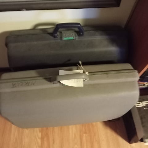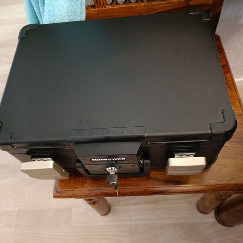 Lukollinen salkku, leveys 44.5cm, korkeus 33, syvyys 10cm. Lukittava numerokoodilla.