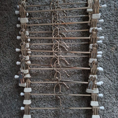 Hyväkuntoiset ripustimet 10 kpl, ripustusleveys 38 cm.