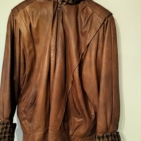 Ruskea nahkainen takki, jossa kaksirivinen nappikiinnitys edessä. Mallissa on etutaskut ja hieman pidempi leikkaus, joka ulottuu lantiolle tai sen alapuolelle. Sopii käytettäväksi arkitakkina tai kevyenä päällystakkina viileämpiin päiviin.