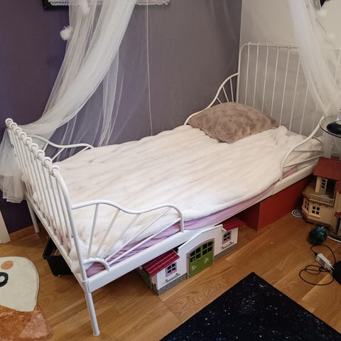Kaunis ikealainen lastensänky patjoineen ja turvalaitoineen. Hyväkuntoinen, pieniä käytönjälkiä.