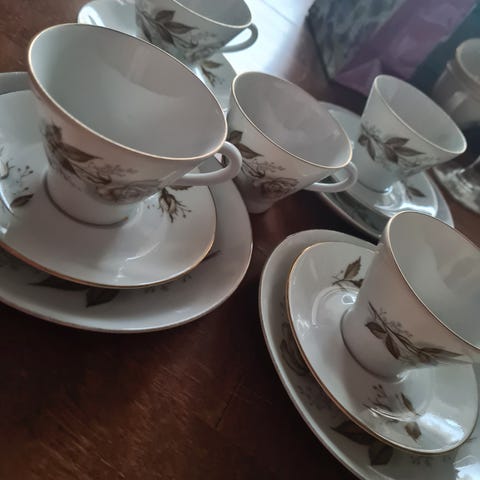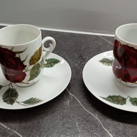 Arabia Ruususarjan kuppeja, lautasia ja asetit