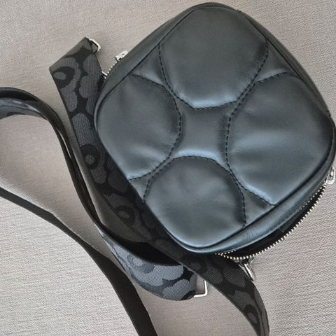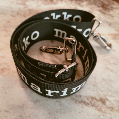 Myydään Marimekon käyttämätön Gratha laukun logohihna. Mustavalkoinen, tekstit molemmin puolin. Hopeat metalliosat.