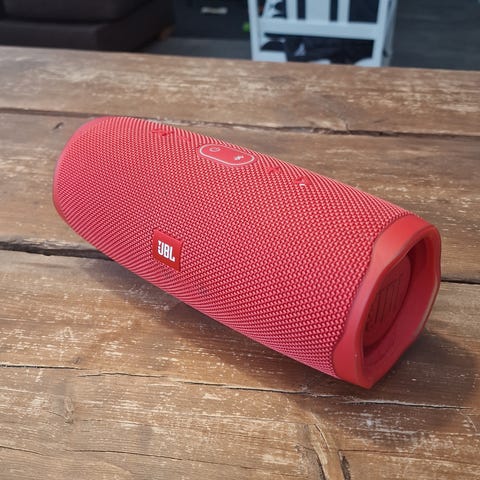 JBL Charge 4 bluetooth-kaiutin tummanvihreällä kankaalla. Kannettava malli, jossa yläosassa äänenvoimakkuus- ja toistonhallintapainikkeet sekä Bluetooth-painike. Takana suojakannen alla liitännät, kuten USB-portti ja latausliitäntä. Sopii langattomaan musiikin kuunteluun esimerkiksi puhelimelta tai tabletilta kotona ja liikkeellä.