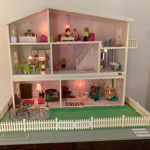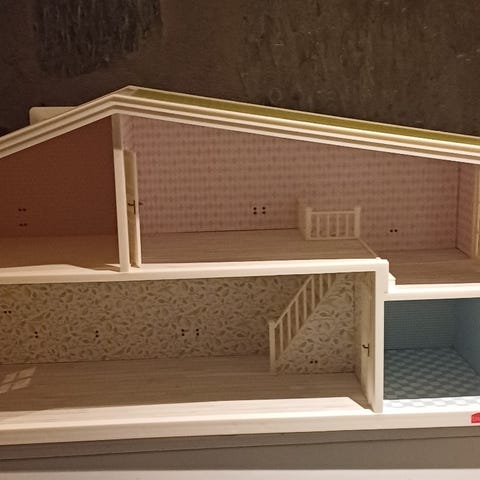 Lundby-nukkekoti kalusteilla. Käytön jälkiä on, näkyvät kuvissa. Uusilla ”tapeteilla” saa helposti pienet kolhut piiloon. On ollut monessa kivassa leikissä mukana😊