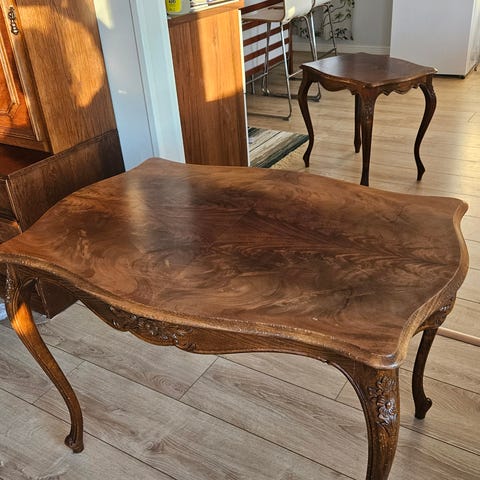 Jämäkkä ja siisti rokokoo tyylinen pieni sohvapöytä. Pinnoitteessa on ajan patinaa jonkin verran. Aivan toimiva kuitenkin sellaisenaan.