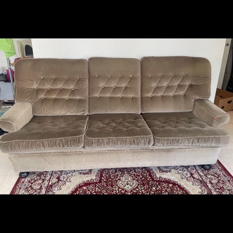 Annetaan keltainen kahden istuttava sohva muuton tieltä. Sohva on ollut kissataloudessa, joten pientä raapimajälkeä ja langanpätkiä on, etenkin käsinojissa. Sohvanpäälliset irrotettavissa ja pestävissä.