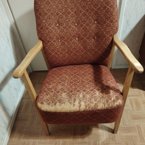 Puinen nojatuoli, jossa tummanruskea runko ja beiget istuin- ja selkänojan pehmusteet. Tuolissa on käsinojat ja korkea selkänoja erillisellä niskatyynyllä. Jalaksissa on jouset, joten keinuminen ei kuluta lattiaa. Istuessa hyvä ja ryhdikäs asento.